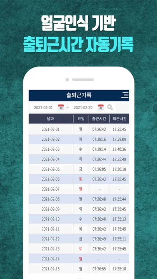2. 출퇴근기록 : 작업자의 일별 출근시간과 퇴근시간을 표시합니다.