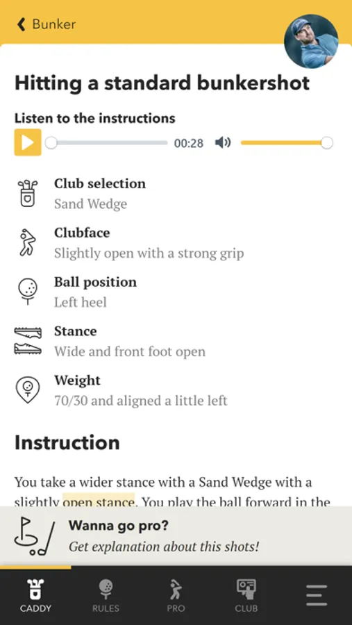 Hello Caddy is the app for and by golfers. Have you ever been plugged in the bunker or behind a tree? From the tee, fairway, bunker, rough etc. Each spot contains a number of possible lies and options to get out of them quickly. Read the information or listen to the explanation, you will quickly know the best club or position to continue playing and that is guaranteed to save one stroke per hole!Just like a pro, you will quickly and simply get the best strokes explained during your round. With these tips you can choose the right club, position and stroke to score optimally. Your virtual caddy always knows the best choice so it's sure to get you a few strokes per hole! With Hello Caddy your handicap flies down!