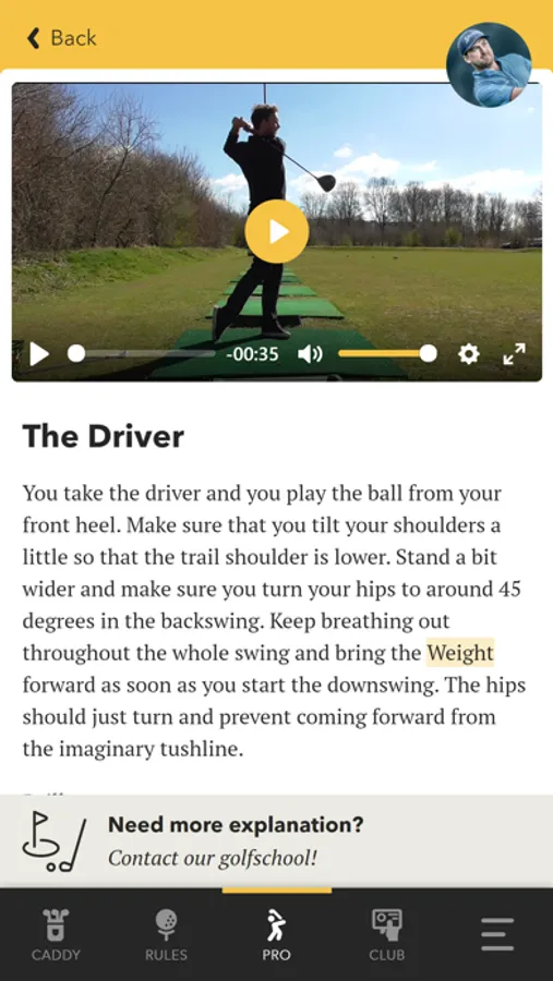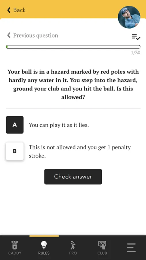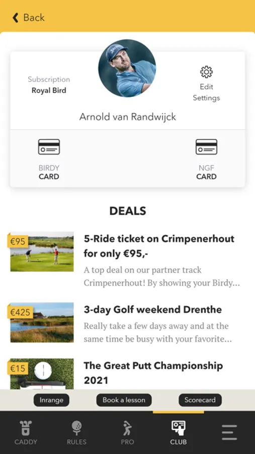 In Hello Caddy you will of course also find the golf rules, logically divided into most common or category. Or practice a rules exam for your handicap 54 course or to brush up on your rules knowledge. The Hello Club environment offers you quick access to your membership details, offers or the Birdy Card. From the home screen you can keep track of all your distances per club so that you can quickly choose the right club for the best shot.Install the Hello Caddy app and get help in the course. Your own virtual caddy who advises you on the best club choice, stance and ball position. With the Birdy Card you get access to the loyalty program or you can pay directly at our locations in the future. Your NGF pass will also be shown so that you can immediately enter the course.
