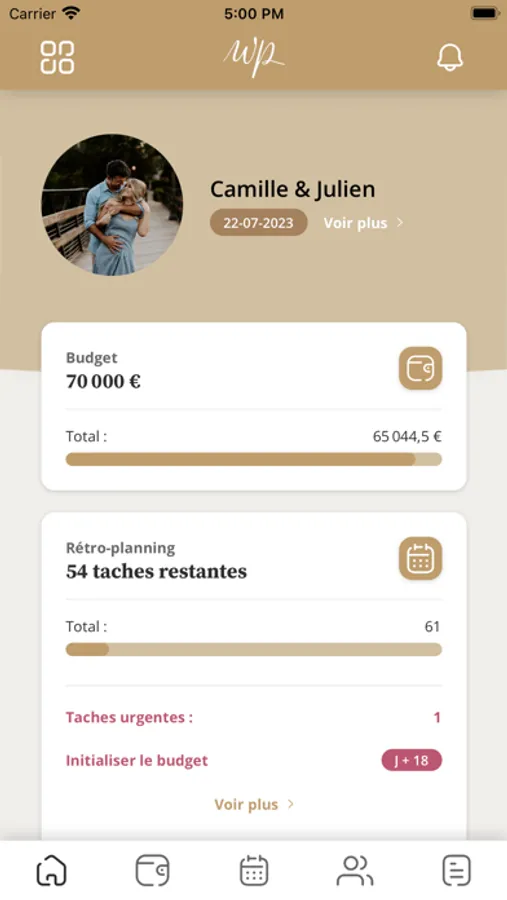 L'application WeddingPlan vous permet de retrouver toutes les informations essentielles à la gestion de vos événements. Synchronisez avec votre interface Web, vous retrouvez la liste des invités, le rétro-planning ou encore le suivi de votre budget
