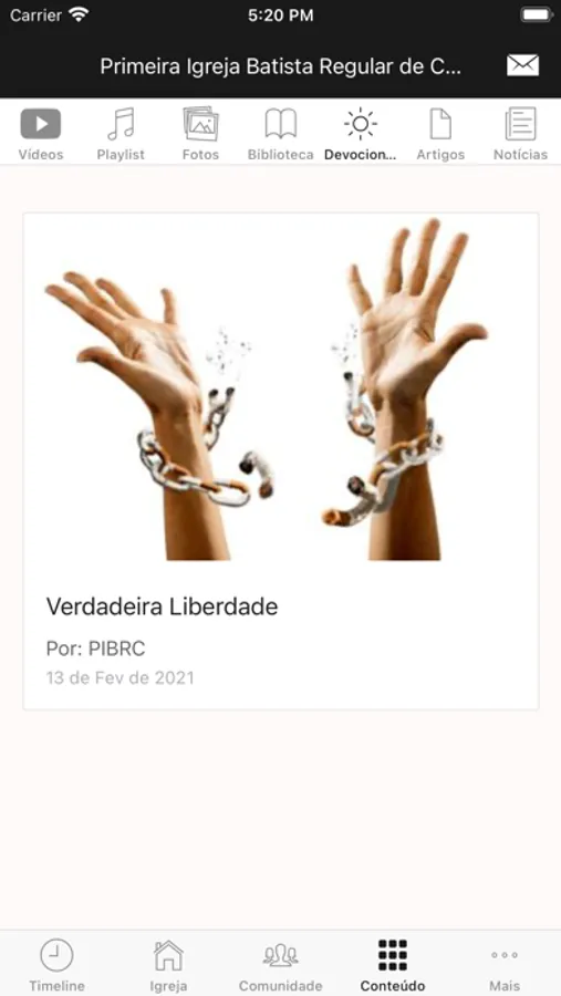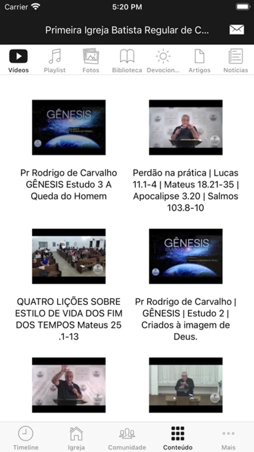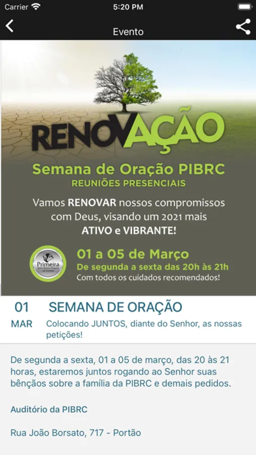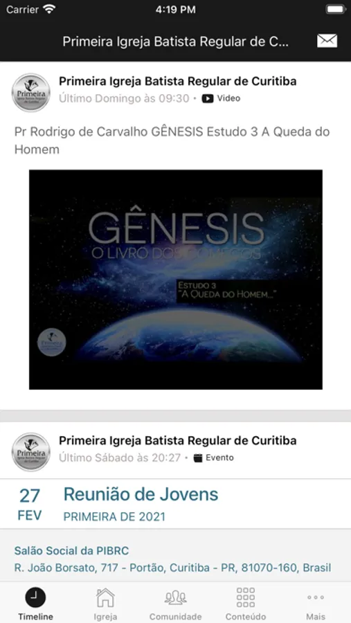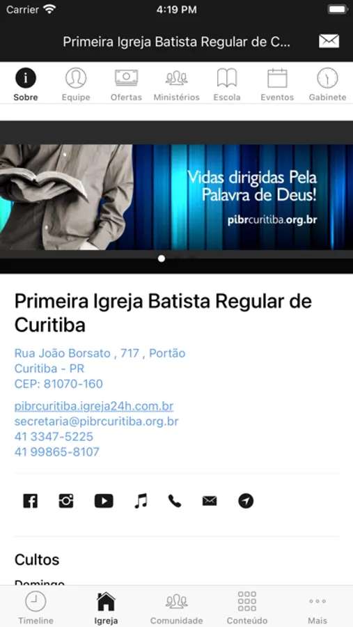- Informações da Igreja (endereço, telefone, site, redes sociais, pastores)