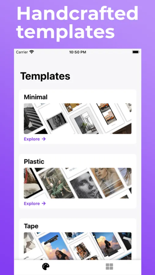 Create beautiful content for social media with handcrafted templates. Add filters and effects to your photos directly within the template. Write your text with unique fonts, select a background color. Then share your story with the world!