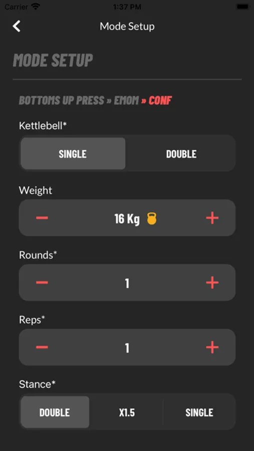 Build your workouts by selecting a ‘single skill’ or ‘build your complex.’ You can choose from our preset exercise selection or add your own skill. Choose whether you have one bell or two, the weight, sets, reps, and rest period length. Once you select your skill, you can move to the mode and choose between Ladder, EMOM, straight sets, or custom. You have the option to add instructions for specifics on your skill or complex and include a link to an external video if examples are needed. After adding all the workout elements, you can start the workout and get to it or save the workout and then generate a link to share or come back to it later.