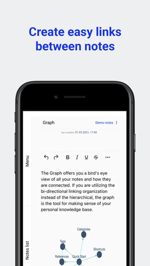 If you are looking to escape the hierarchical organization, no problem! By using bi-directional links, you can forget about sorting your notes in folders and subfolders since all your notes will be connected in a web of knowledge - graph.