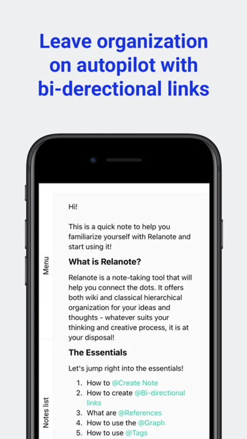 Relanote is а tool that combines both hierarchical and non-hierarchical note-taking. The files and folders method allows you to put some order while the bi-directional links to connect the dots and see the bigger picture. By leveraging the power of both methods, Relanote adapts to your way of thinking.