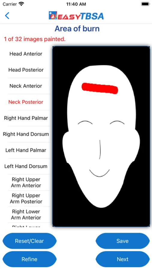 When using this application, it is important to remember to only shade areas that have a partial thickness burn or a full thickness burn. Superficial burns should not be included when calculating the TBSA of the burned patient.