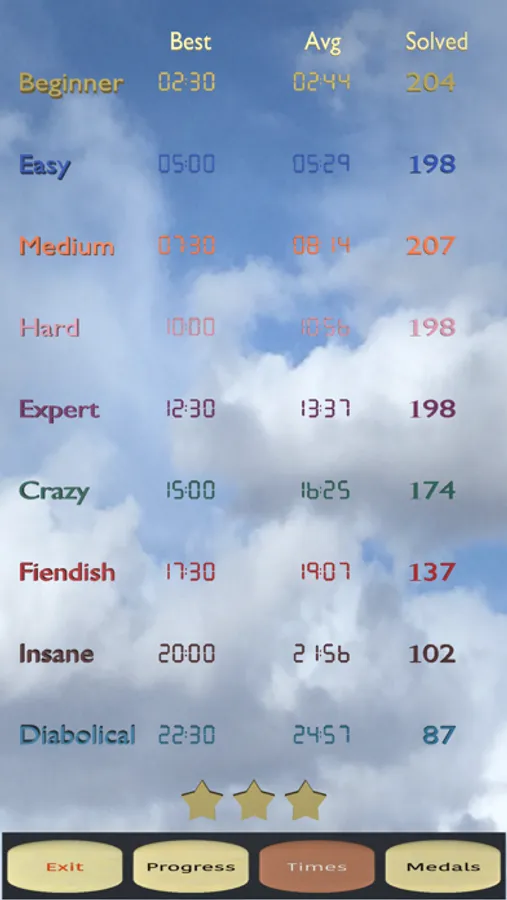 * Improve on the time for a previously solved puzzle, or solve again without using hints to earn more stars.