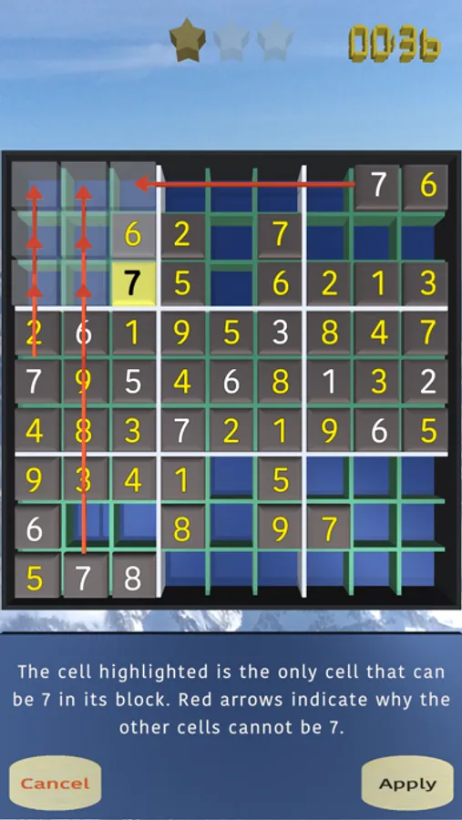 * Improve your Sudoku skills by solving puzzles with small hints. Small hints indicate what to look for without directly revealing the next step. Switch to a big hint, if necessary, while learning a particular solving technique.