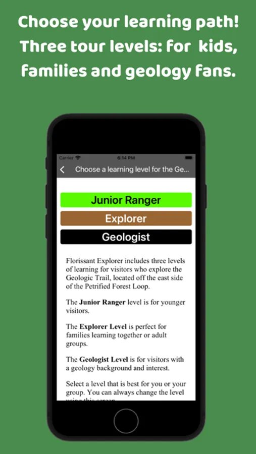 Florissant Explorer emerged from a research project designed to explore "what works" for visitors to National Parks who use their own smart devices as electronic aids to interpretation. The app is used by visitors for navigation and interpretation as they use the trail system at Florissant Fossil Beds National Monument in Colorado. Florissant Explorer concentrates on the geology, ecology and history of the monument, presenting visitors with "place-based" video interpretation based on their location. A feature that is unique to this application is that visitors can choose one of three interest/experience levels for the Monument's geology trail, allowing interpretation to be tailored to that choice. This helps avoid the one-size-fits-all signage that parks, out of necessity often implement.