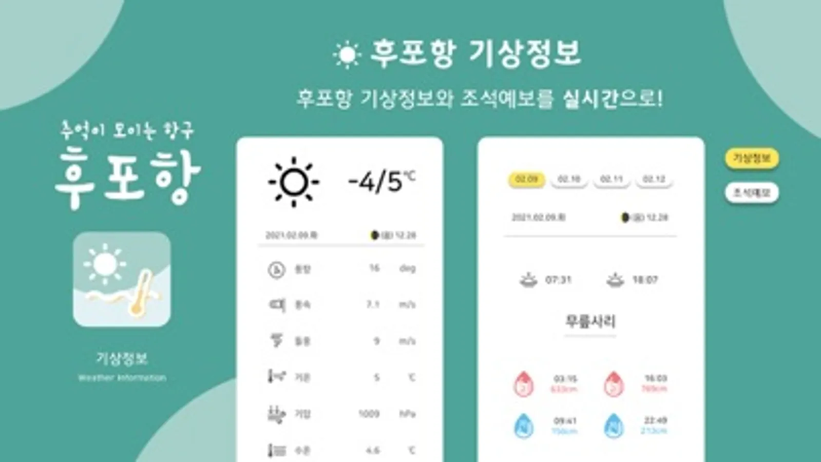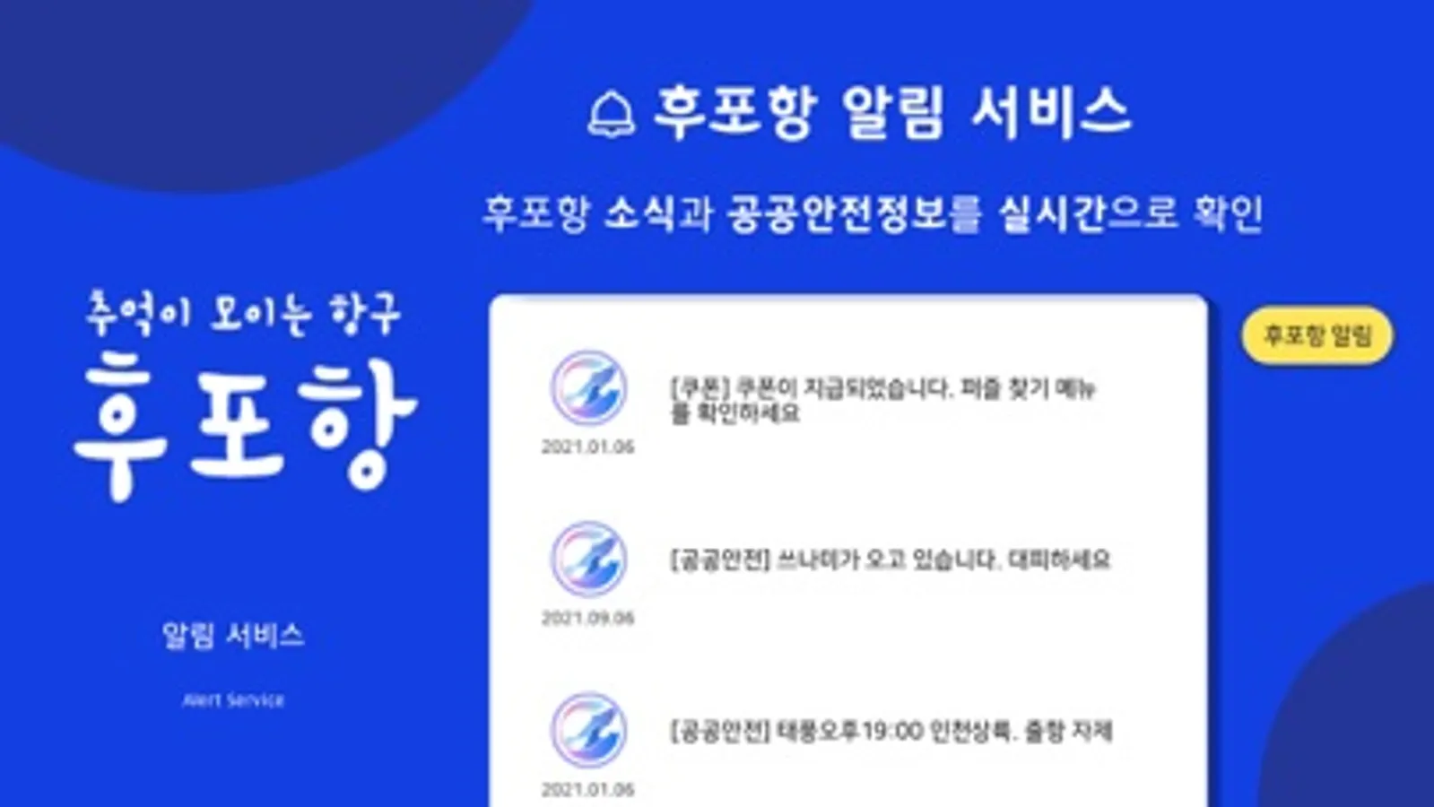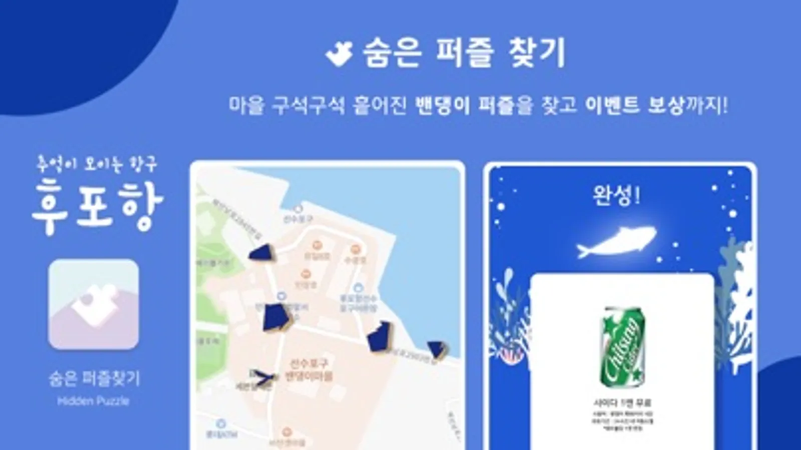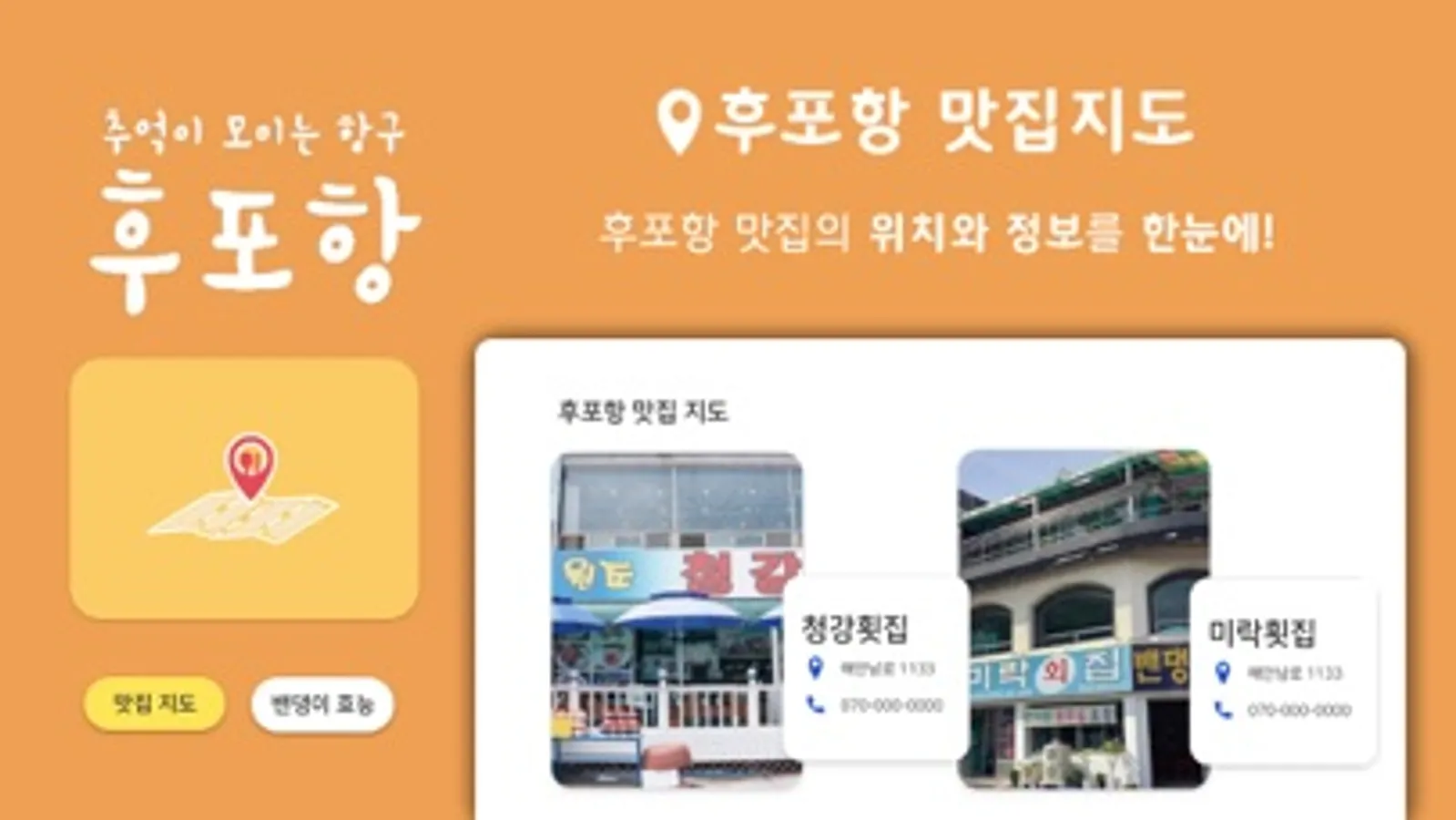 앱 후포항은 지역의 역사와 정보를 캐릭터가 친절히 설명해주는 후포항 이야기, 후포항 곳곳에 퍼져있는 퍼즐을 찾는 참여형 게임, 실시간 물때와 날씨를 알수있는 "오늘의 후포" 그리고 후포항의 맛집의 위치, 맛집의 메뉴를 살펴볼수 있는 맛집소개로 구성되어 있습니다.