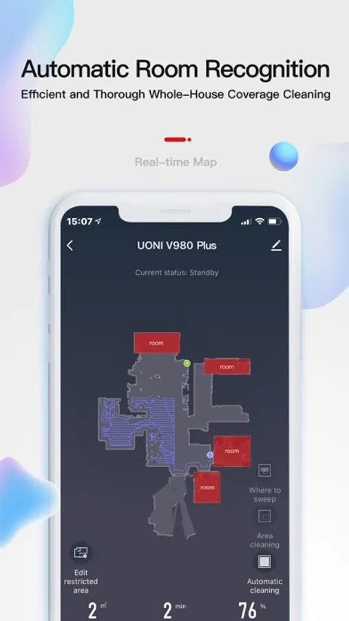 • View real-time stats from the visual map of your home, areas cleaned, and cleaning time
