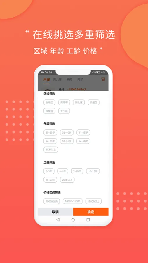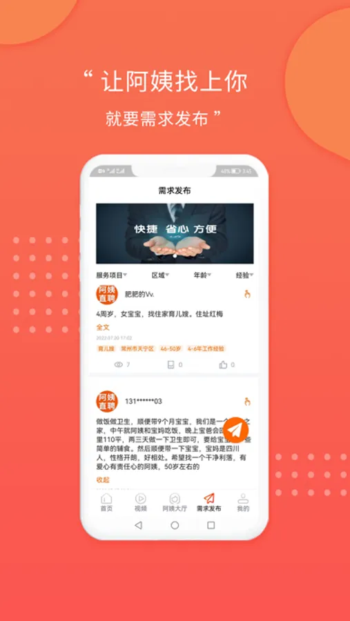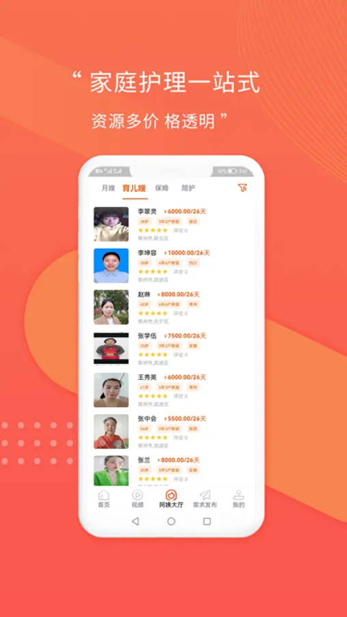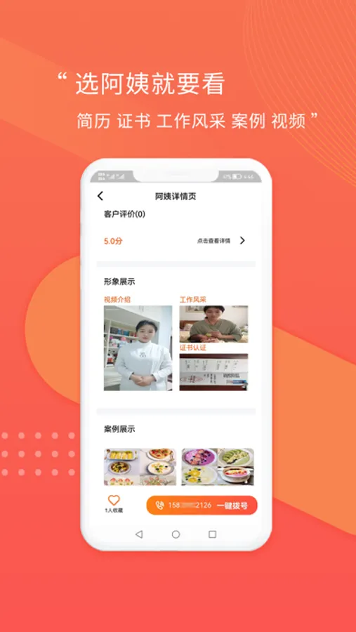 阿姨直聘APP,是家庭护理阿姨的资源平台,提供从事月嫂、育儿嫂、保姆、陪护服务人员在线资源,客户“面对面”选阿姨,首先查看阿姨资料(简历、技能、证书照片、工作照片、视频、案例、好评),对阿姨有了初步了解,选中后可直接电话约阿姨面试,约定线下服务。也可在线发布需求,让阿姨主动找上你。客户可在线精挑细选。阿姨直聘APP给了客户更多挑选自由,更容易找到满意的阿姨。
