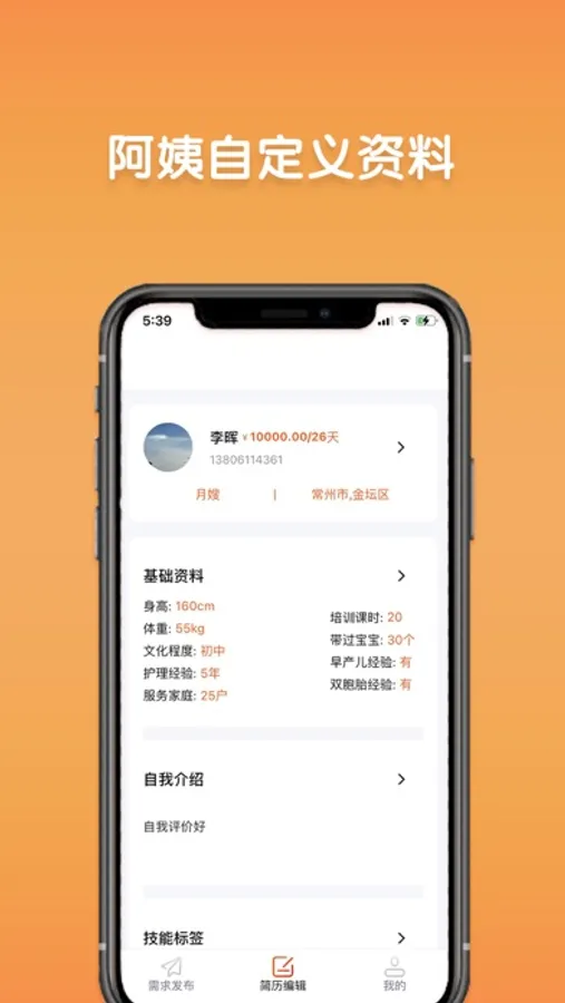 阿姨直聘服务端APP-家庭护理阿姨管理平台。用于服务阿姨资料管理,如阿姨简介、视频展示、案例发布、证书展示、风采展示等。另外接收查看客户发布的需求。