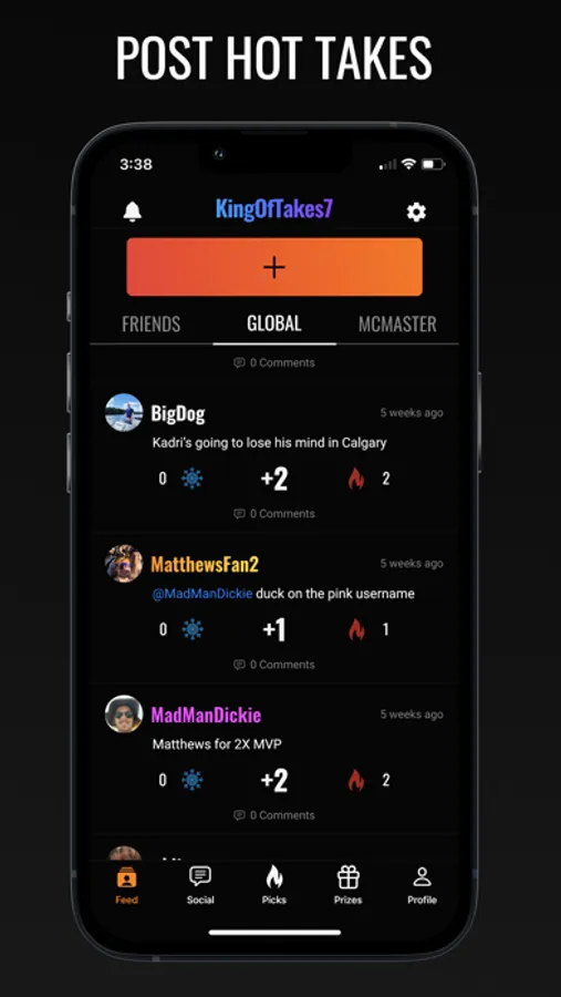 - Personal Profile: Tailor your experience by personalizing your profile! All players have a unique username, bio, and favourite team. Your profile is where your friends can check out your takes and picks, or view stats such as your total number of upvotes, friend count, record, win percentage, streak, global ranking, and more! Improving your win percentage also unlocks different colors and gradients to make your username stand out!