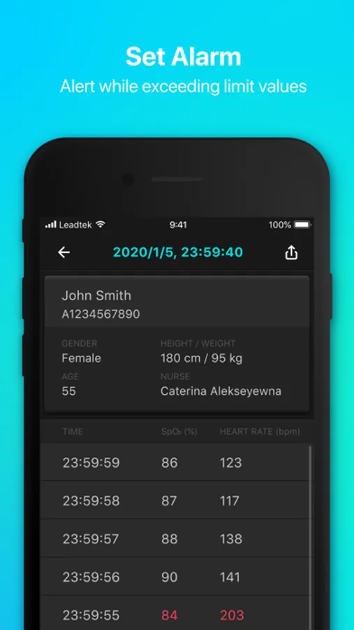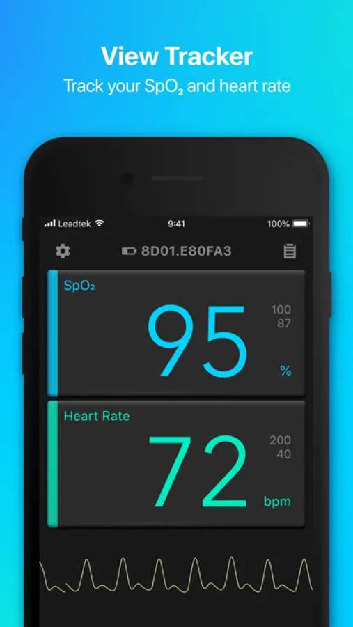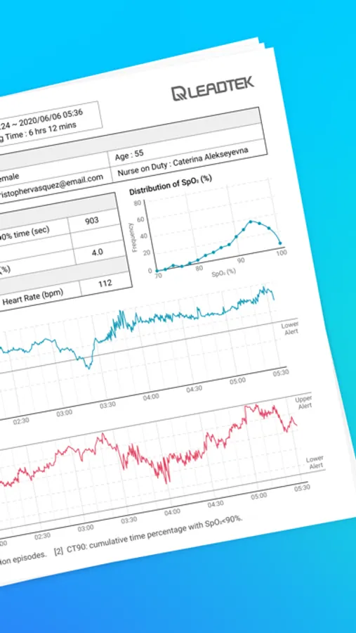 User wear Leadtek’s bluetooth fingertip pulse oximeter, pairing with ViewTracker App. It will keep recording SpO2 and pulse rate while sleeping.
