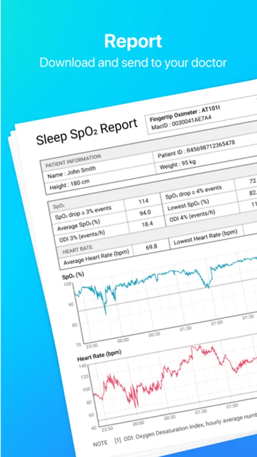 Sleep oximetry report generated by Viewtracker APP, the report will present the analysis of sleeping condition with parameters including: Lowest / average SpO2 and pulse rate, ODI 3%, ODI 4% and CT 90% sleep SpO2 concentration. Through the report, your doctor can learn whether a patient has any sleeping condition via the SpO2 and pulse trend analysis data.