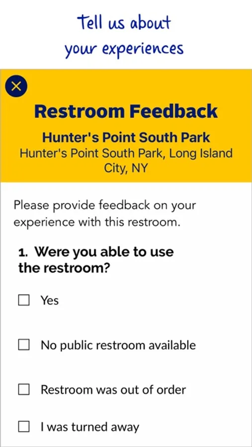 We hope you will use and enjoy this app. Please feel free to contribute any restrooms that you think are missing from our map!