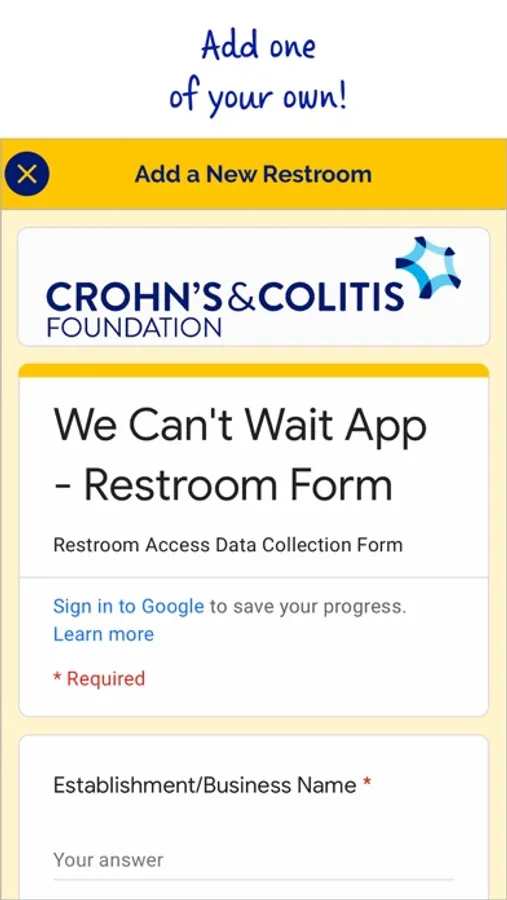The “We Can’t Wait” app offers Crohn’s & colitis patients and others a simple and fast way to locate publicly accessible restrooms and helps identify sympathetic establishments.