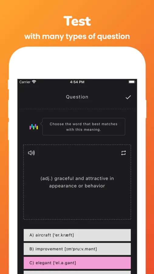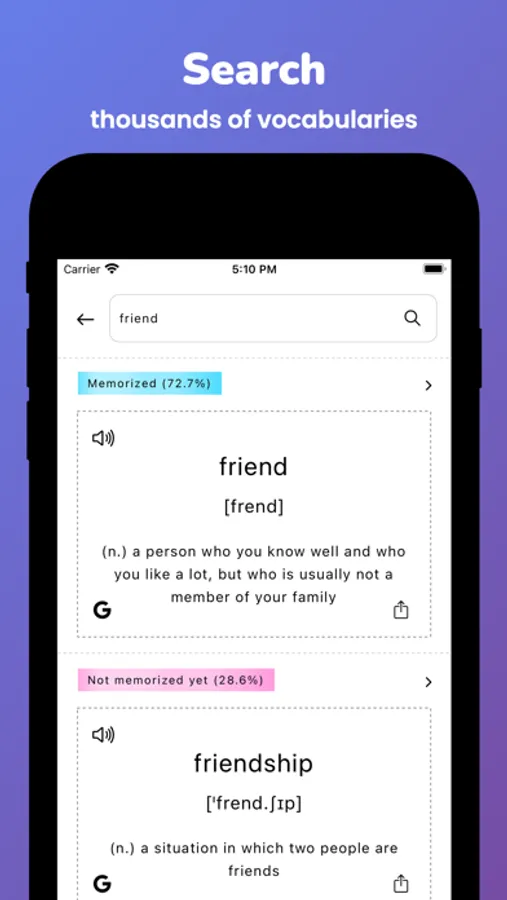 -By comparing your habit to other users, AI continuously personalizes the level of difficulty and the amount of your test for effective vocabulary memorization.