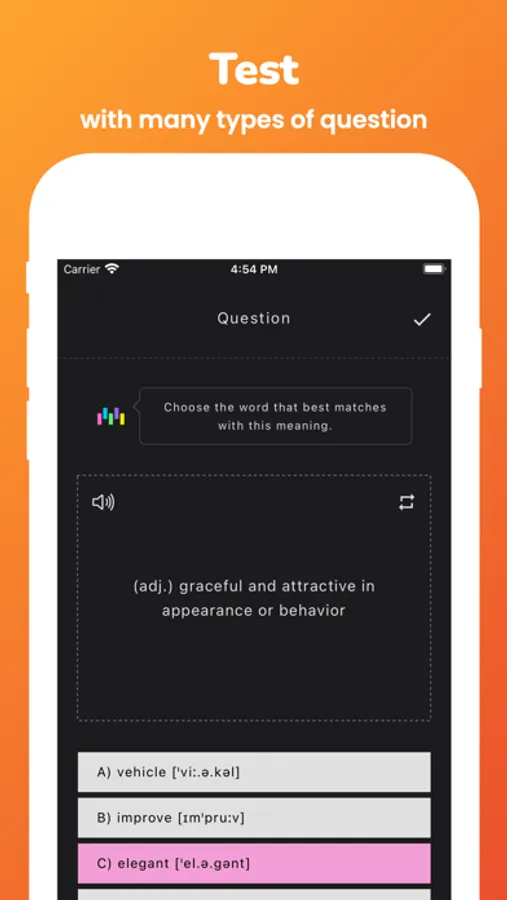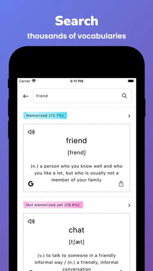 -By comparing your habit to other users, AI continuously personalizes the level of difficulty and the amount of your test for effective vocabulary memorization.