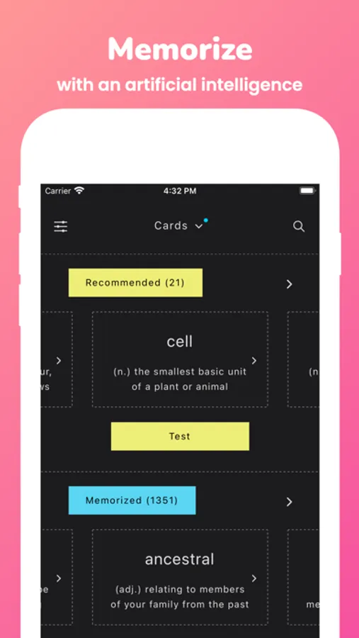 -By comparing your habit to other users, AI continuously personalizes the level of difficulty and the amount of your test for effective vocabulary memorization.