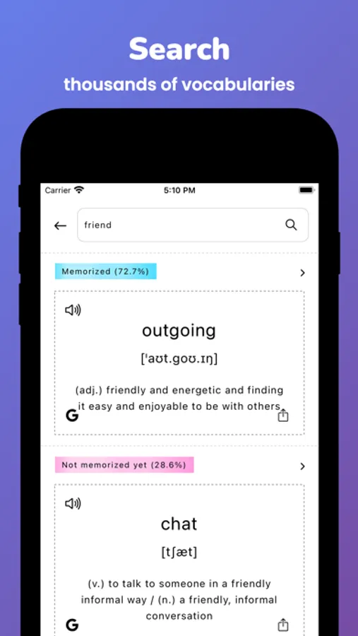 -Detailed stats on your overall progress, whole English dictionary and individual words that you memorized