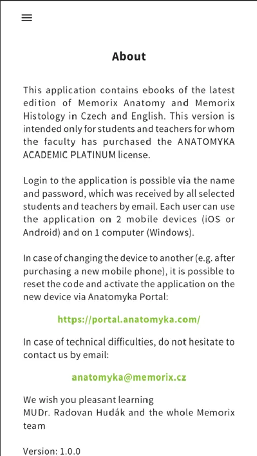 This application contains ebooks of the latest edition of Memorix Anatomy and Memorix Histology in Czech and English. This version is intended only for students and teachers for whom the faculty has purchased the ANATOMYKA ACADEMIC PLATINUM license. Login to the application is possible via the name and password, which was received by all selected students and teachers by email.