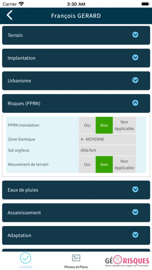 SCOPLAN TERRAIN est synchronisé avec GÉORISQUES. Ainsi les données liées aux risques de sismicité, d'argiles, d'inondation ect.. sont automatiquement collectées.