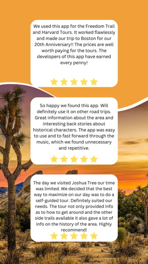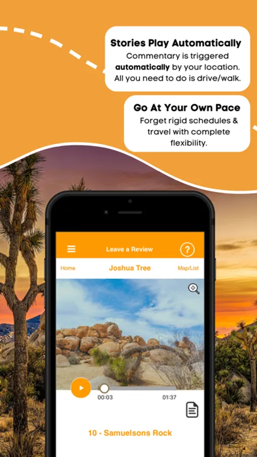 Start from any of the park’s entrances (Joshua Tree, Twentynine Palms, or Cottonwood) and tour with total flexibility. Featuring riveting stories, a great narrator, and easy automatic audio, this app puts exploration in the palm of your hand!