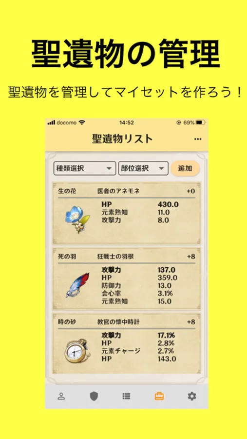 3. アプリ内の登録画面から保存した登録したい聖遺物を選択してください。