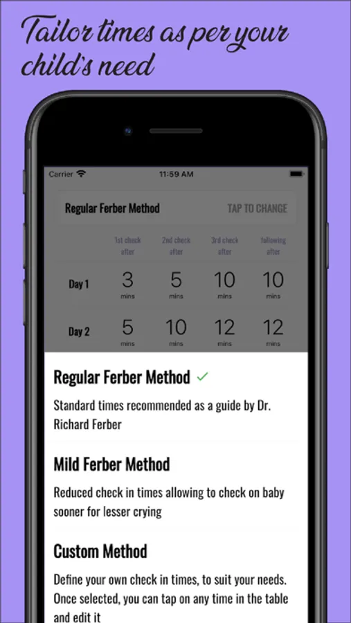 The very simple and intuitive app, will help you with the tips and tricks, preparation and FAQs you need to be aware of. The app also allows you to choose a milder method, which allows you to check in earlier than the times recommended by Dr. Ferber, as well as making up your own times.