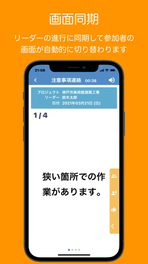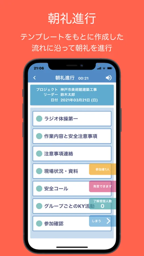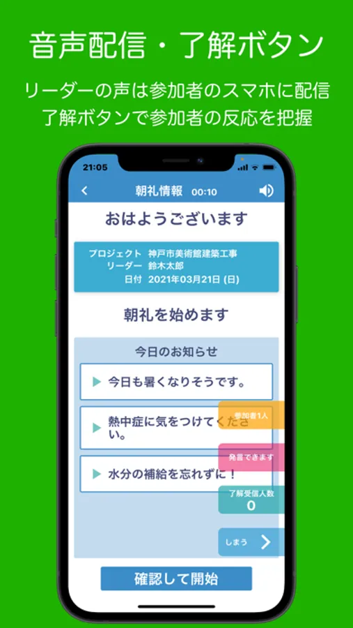スマホを用いて、リモートでお互いの距離を保ちながら朝礼を行うことができます。音声通話の機能を持ち、朝礼リーダーの声が参加者のスマホに配信されます。