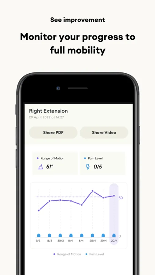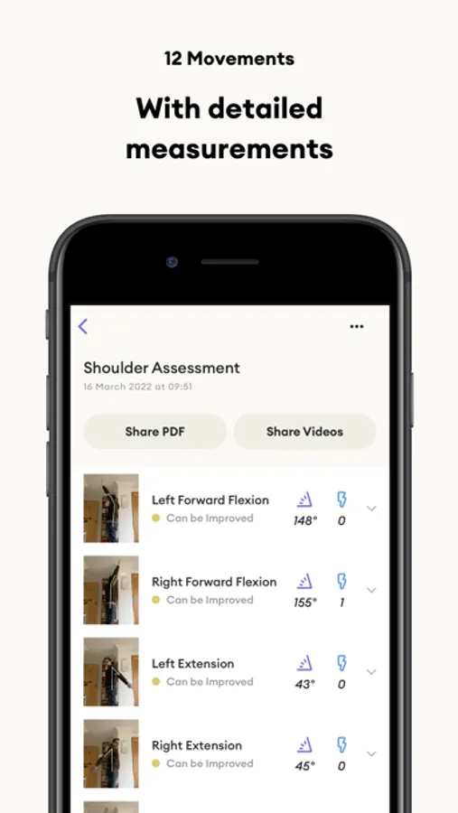 Using your phone’s camera, sophisticated AI technology recognizes your shoulder and guides you into position to capture measurements. In just five minutes, you can complete the exercises that help measure your range of motion. These exercises also pull double duty to help you rebuild strength in your shoulder muscles and ligaments.