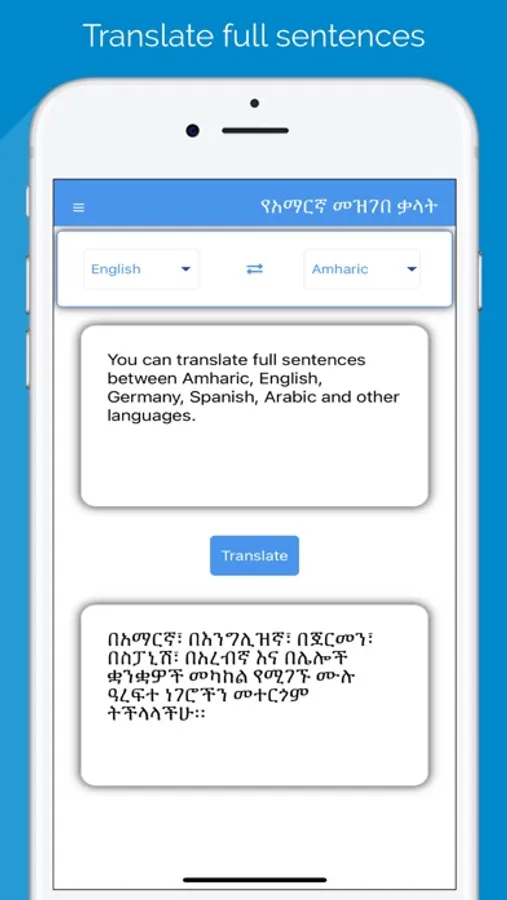 1: You can translate full sentences and define words between Amharic, English, Spanish, Swedish, Norwegian Dutch, Hebrew, French, German, Italian, Arabic and Tigrinya.
