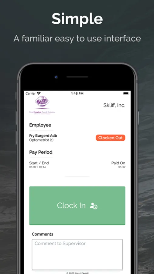 The Slate Payroll App allows you to manage your time clock status on the go, or even set up a company terminal with a larger device.