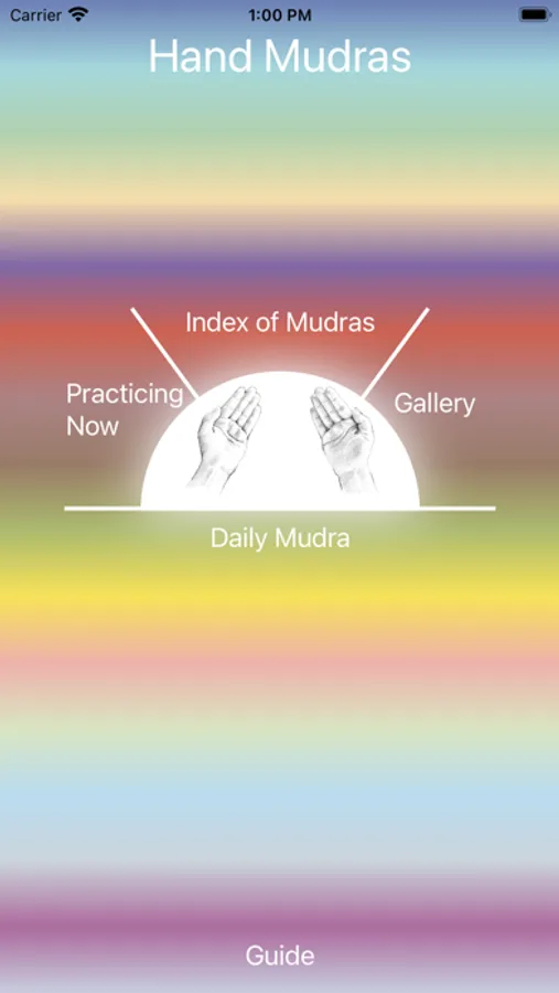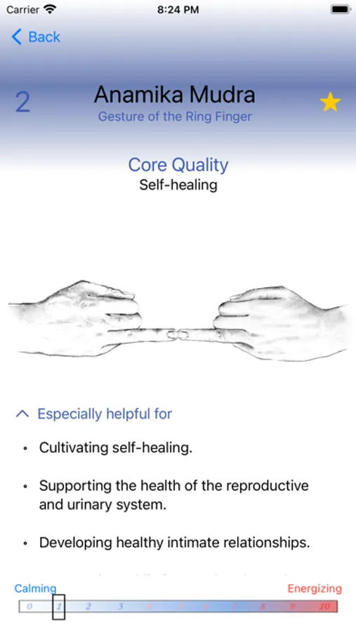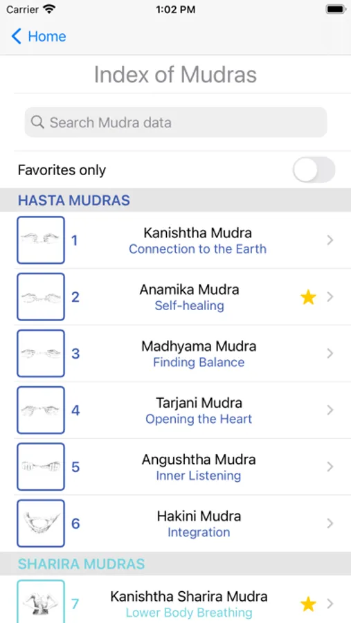 Index of Mudras - shows a list of all Mudras organized by group families from which you can access and browse the gestures. You can also search for a word or phrase and browse the Mudras related to the phrase.