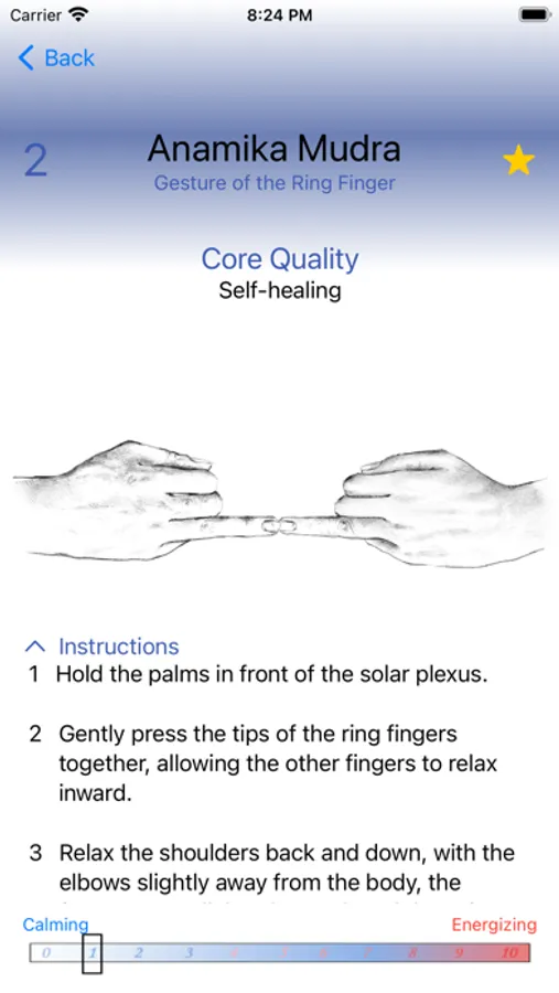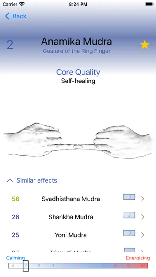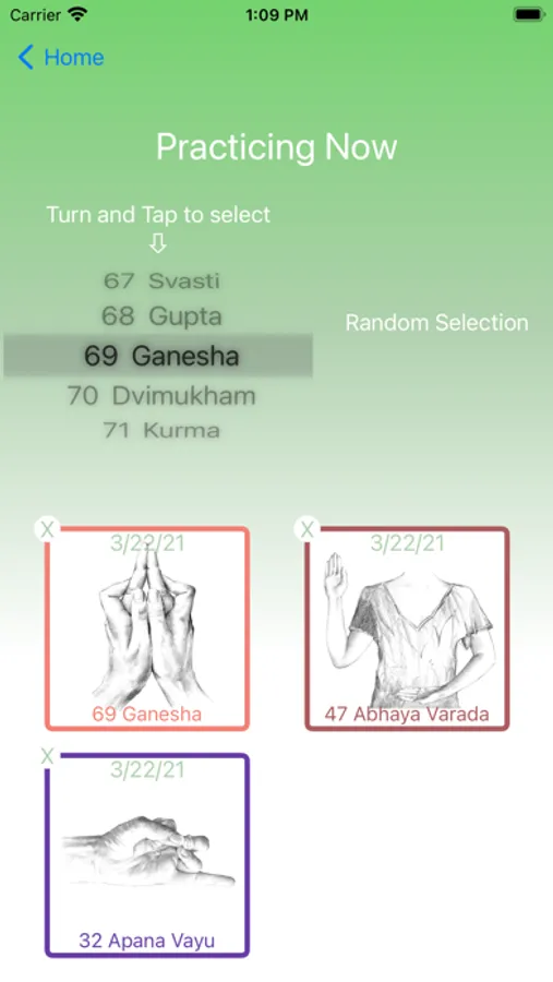 Practicing Now - you can place here the Mudras you are practicing for quick access and easy control of your regular practice. You can also add to this list a gifted mudra, by clicking in random selection.