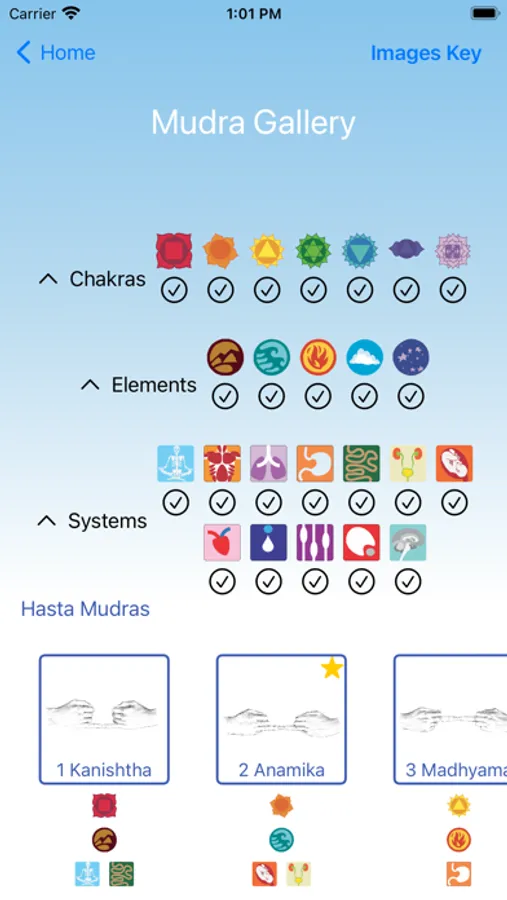 Gallery - shows all Mudras images organized by group families. You can select Mudras associated with specific Chakras, Elements and Systems.