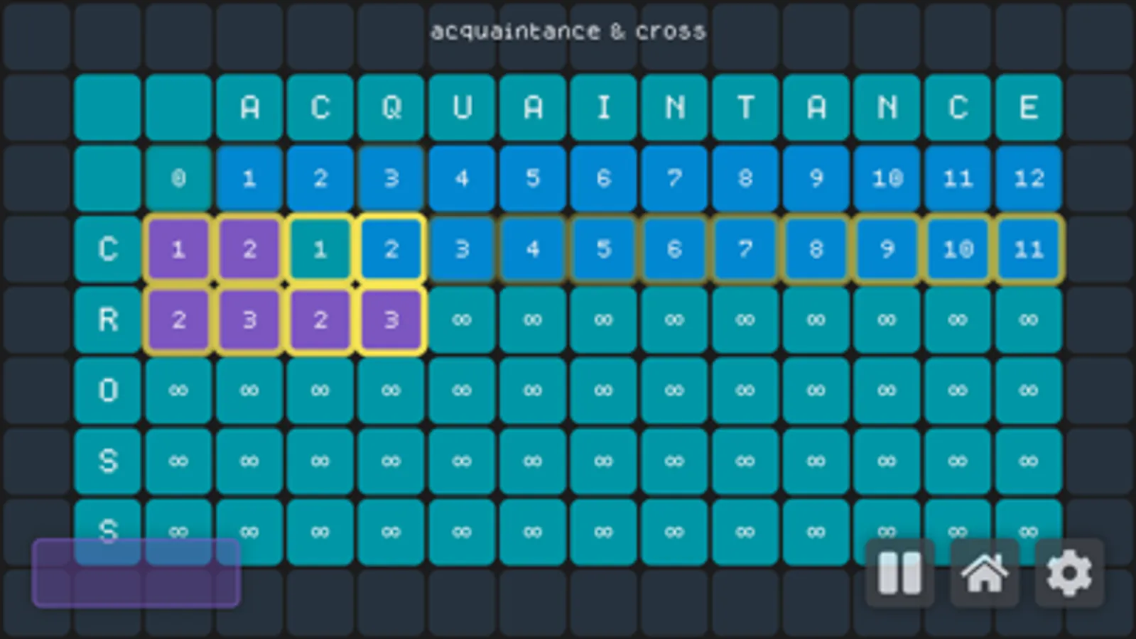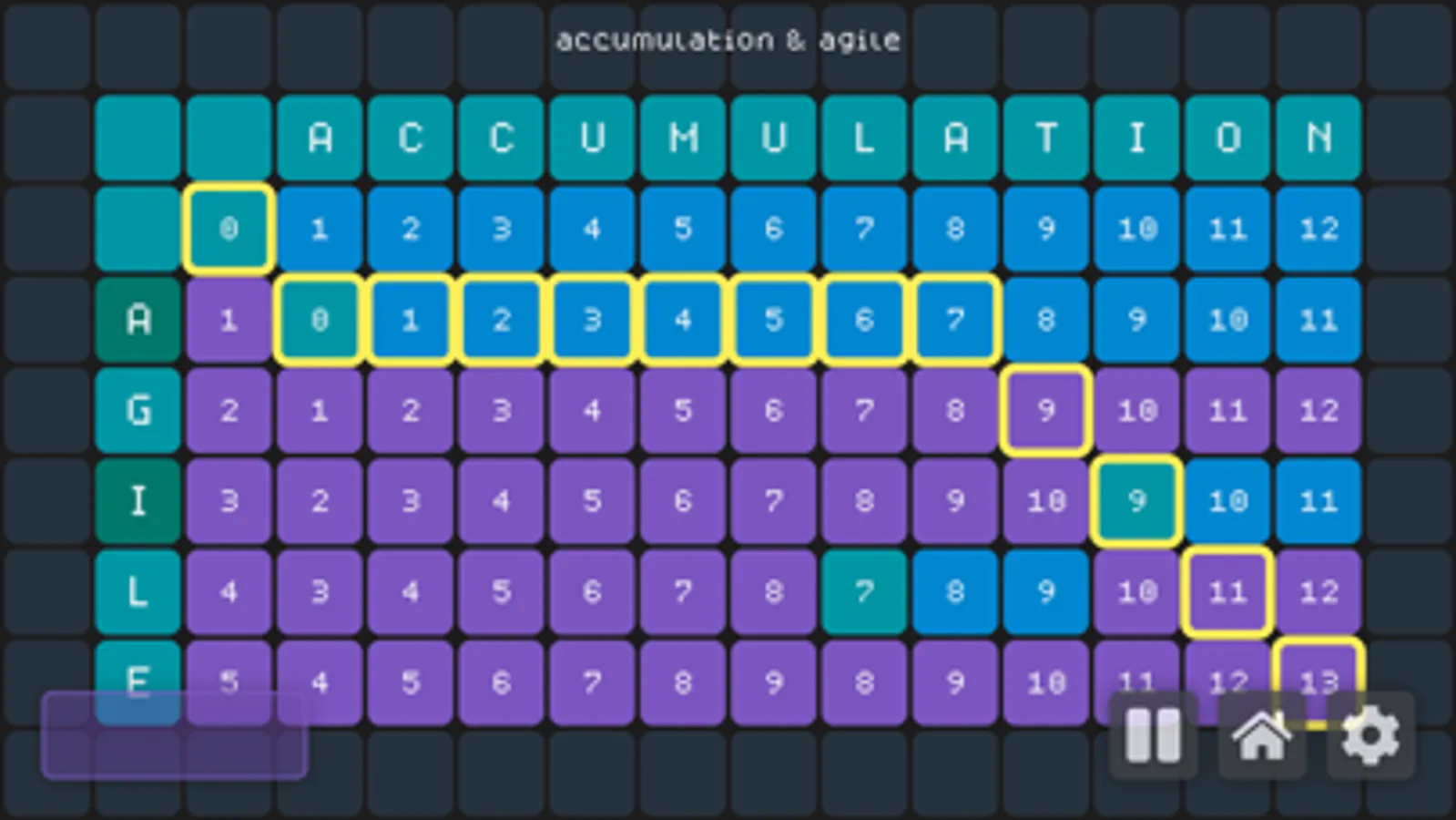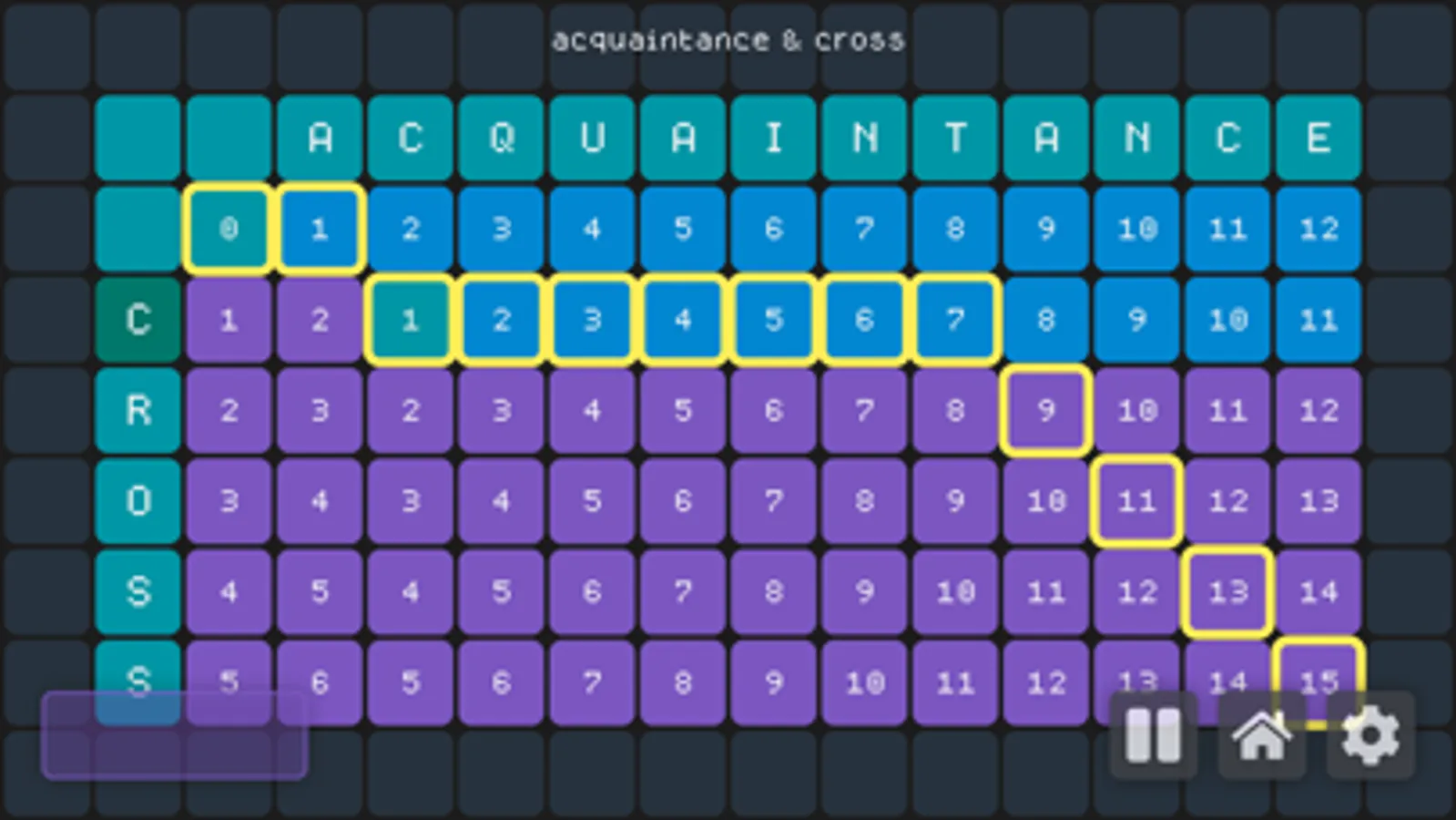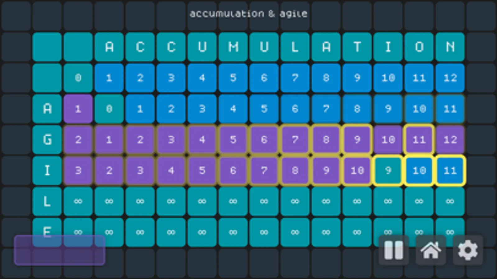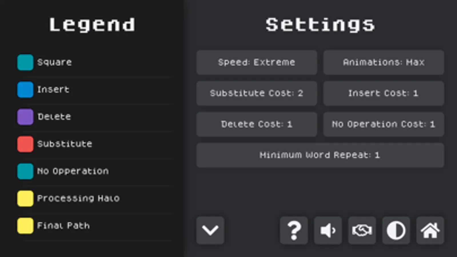 Currently, the app features 1 Dynamic Programming Algorithm. You can change the wights of each of the 4 operation costs and customize how long of a string you want. You also get simulation speed control & fully customizable gameboard colors. All of this and more with String Alignment.