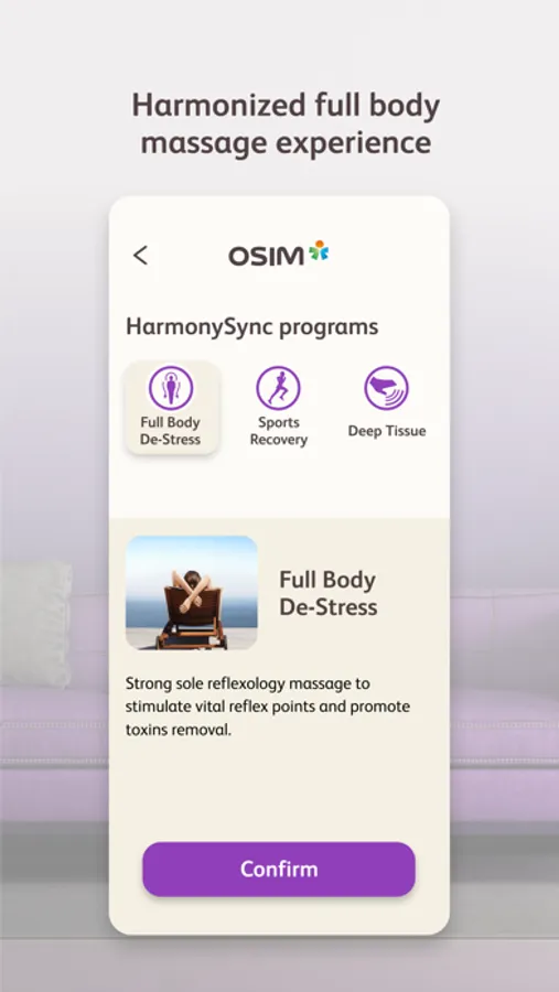 Exclusive to the Smart DIY Massage Chair, the HarmonySync programs are engineered to synchronize the back and leg programs to deliver a harmonized full body massage experience.