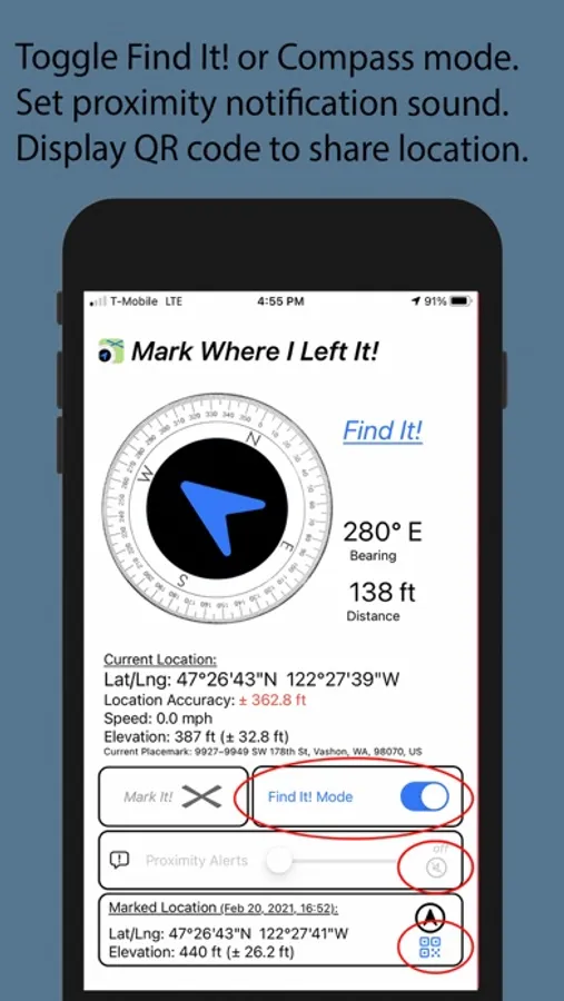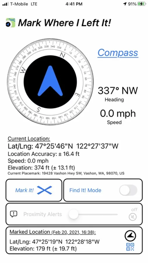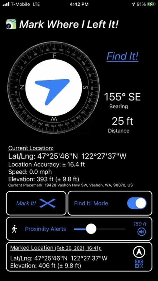 This app allows you to mark and save a location for later return, using your phone’s internal GPS. It can then direct you back to the marked location. While in use, the app monitors your distance and heading back to the marked location, as well as speed, elevation, and location accuracy. It also acts as a compass, and can display general location information from your phone such as latitude, longitude, speed, location accuracy, and if internet is available, placemark address information is displayed.