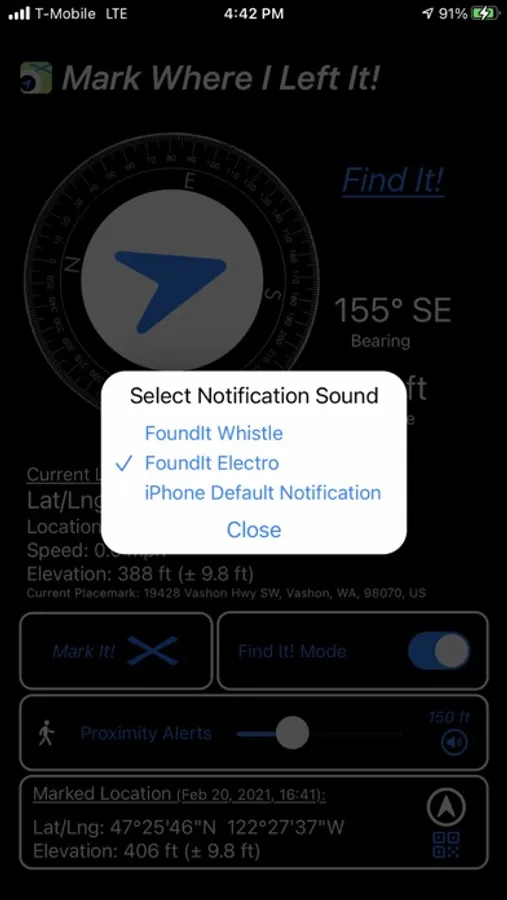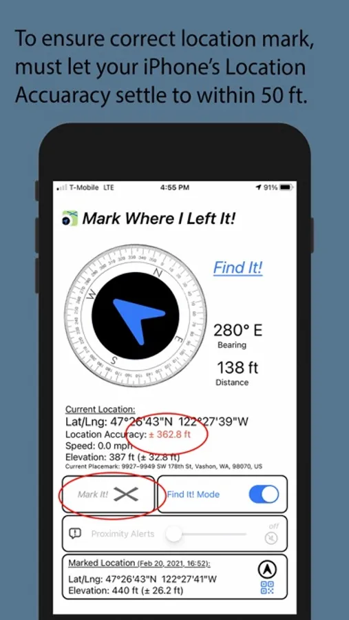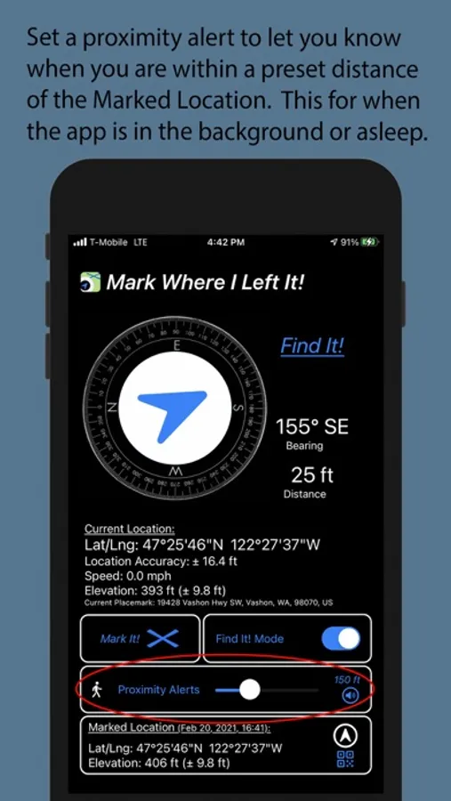 Important note: It can take up to 30 seconds for your phone’s internal location accuracy to resolve. Your phone’s location accuracy must be less than 50 ft to allow you to save the location. This is to prevent possible notification failures. Accuracy is dependent on your device. Accuracy can also depend on terrain or obstructions like dwelling walls or buildings. If issues, adjust slider to a greater proximity distance. Your iPhone must not be in Airplane Mode if using background notifications.