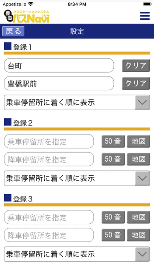 乗車停留所と降車停留所の組合せを最大四件まで登録できます。