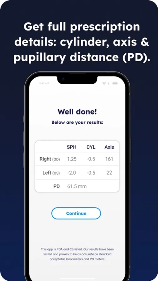 myRx Lens Scanner is FDA and CE Listed. The results have been tested and proven to be as accurate as the standard acceptable for lensometers and PD meters.