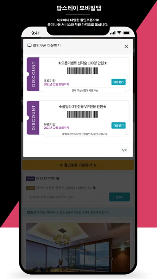 - 쿠폰, 포인트, QR 등 숙소 자체에서 할인권 무제한 발행