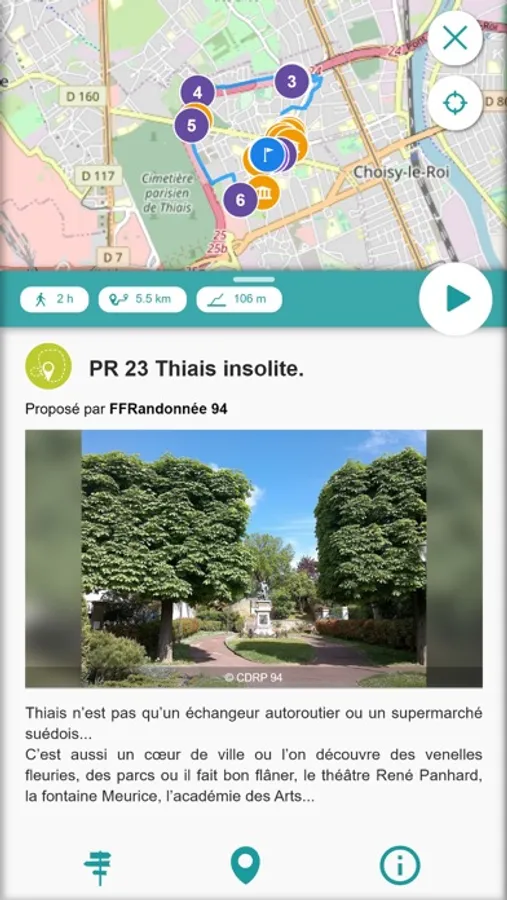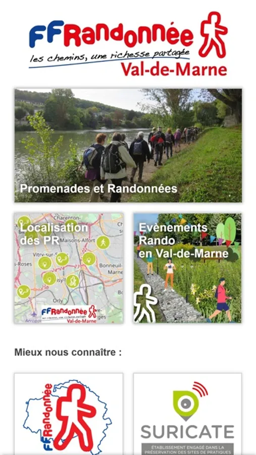 Dans cette application dédiée aux balades et randonnées dans le Val de Marne, vous découvrirez près de 40 itinéraires en pleine nature, en forêt ou en milieu urbain, tous balisés et entretenus par le CDRP94 avec le soutien du Conseil Départemental.