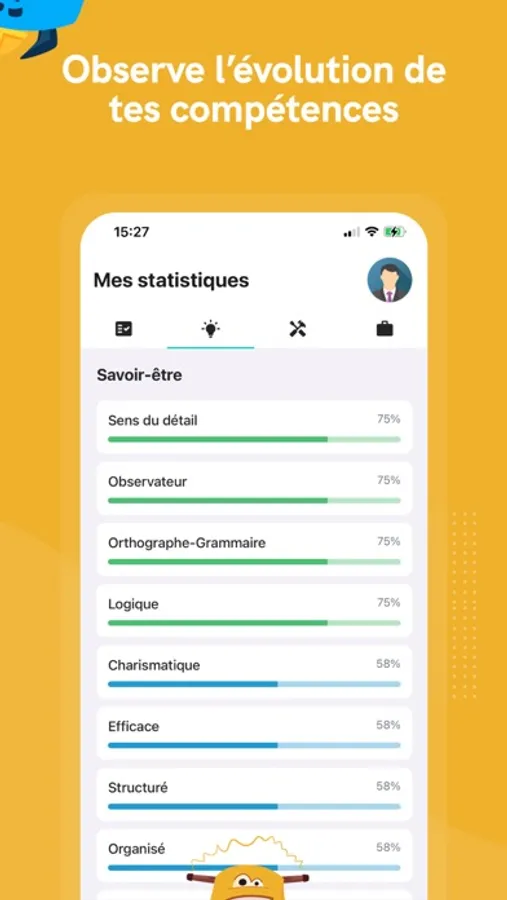 ⟶ Observe ton évolution : Prend consciences de tes compétences et observe l’évolution de celle-ci lorsque tu complètes un nouveau quiz !