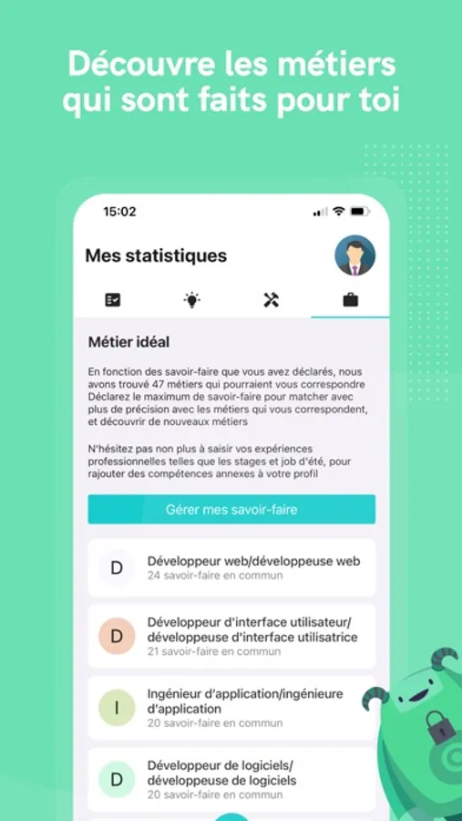⟶ Trouve ton job idéal : Bénéficie d’une suggestion de métier pour lesquelles tu es compatible ! Notre algorithme s’occupe de déceler des points communs entre tes savoir-faire et savoir-être et les prérequis de chacun d’eux.