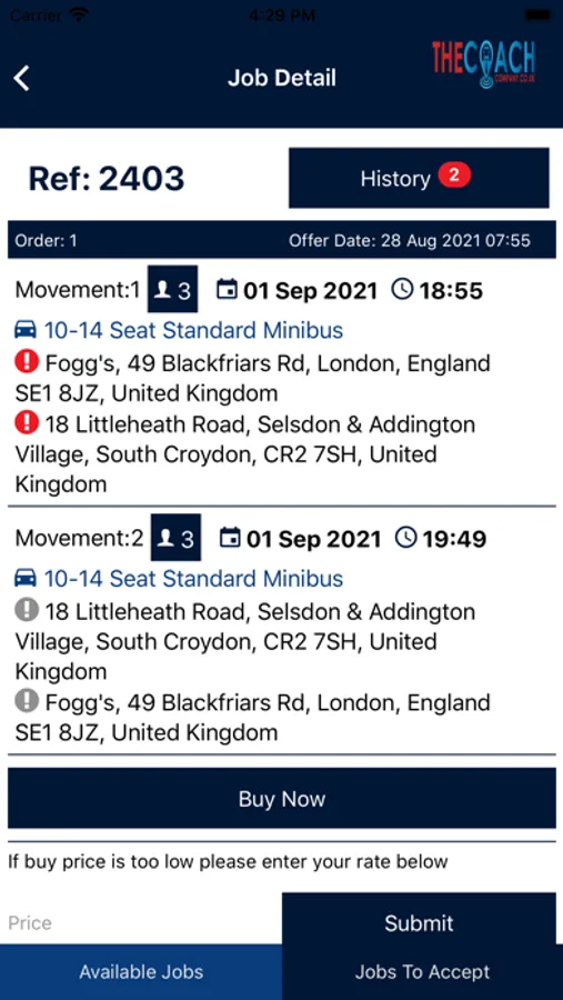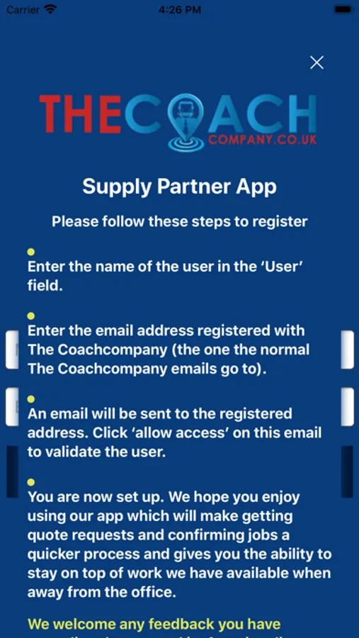 TheCoachCompany Supply Partner App is use by authorised Supply Partners of TheCoachCompany. The app will enable Supply Partners to be notified of new jobs in their area.