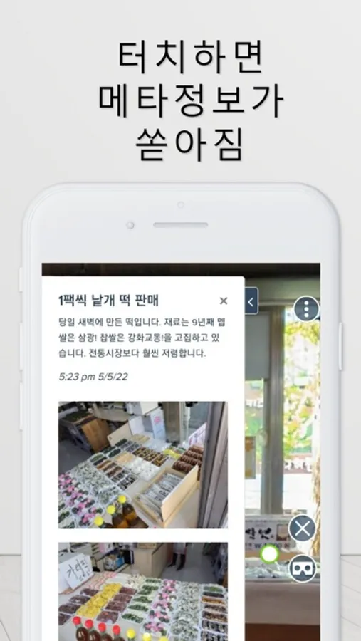 콤팩트한 VR 가상현실 신기술 공정으로 상점의 공간과 메타정보들을 플랫폼 속으로 그대로 가져오는 것. 3D 가상현실 공간에서 그대로 재현하고 상점주에게 묻지 않으면 모를 정보와 설명들을 가상현실에서 핫스폿 클릭 몇 번으로 모두 볼 수 있고 구매링크를 통해 구매도 합니다.